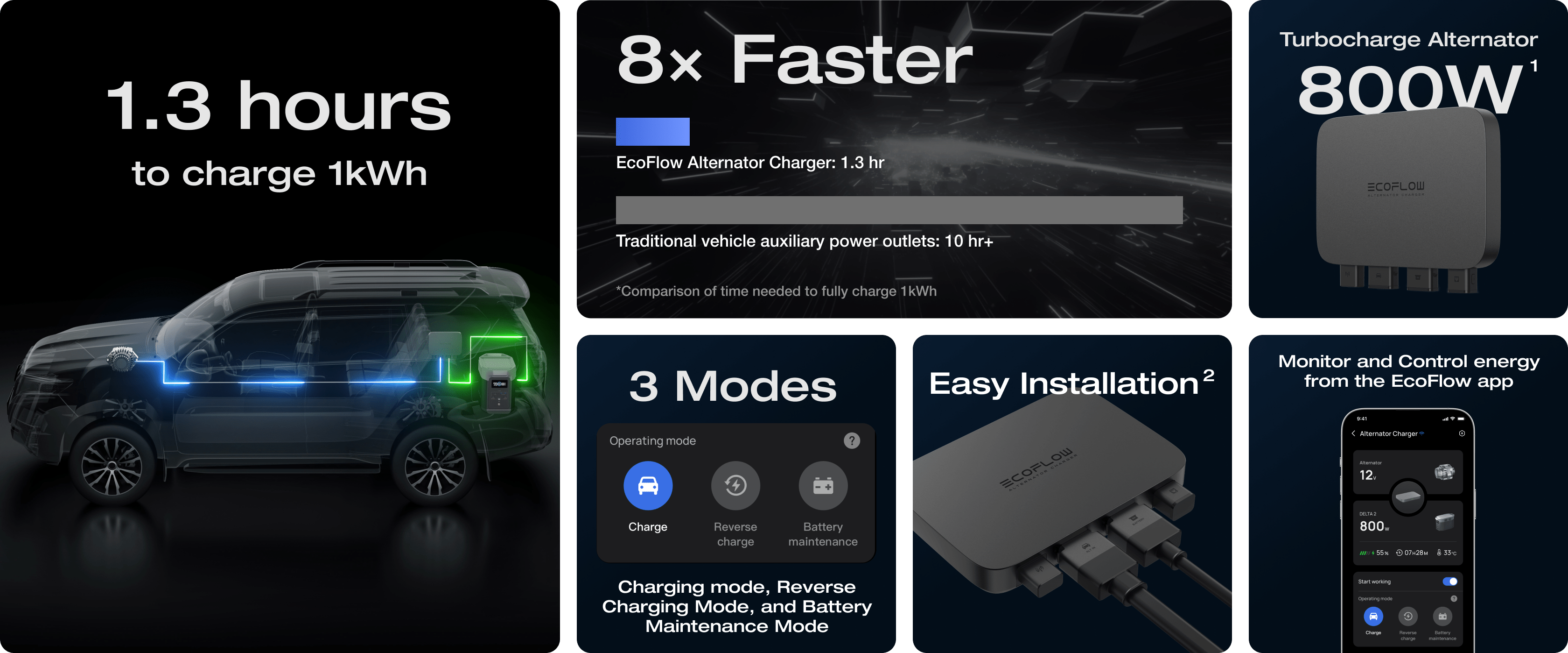 Charge 8× faster while you drive with our EcoFlow 800W Alternator Charger and recharge your power station in only 1.3 hours.