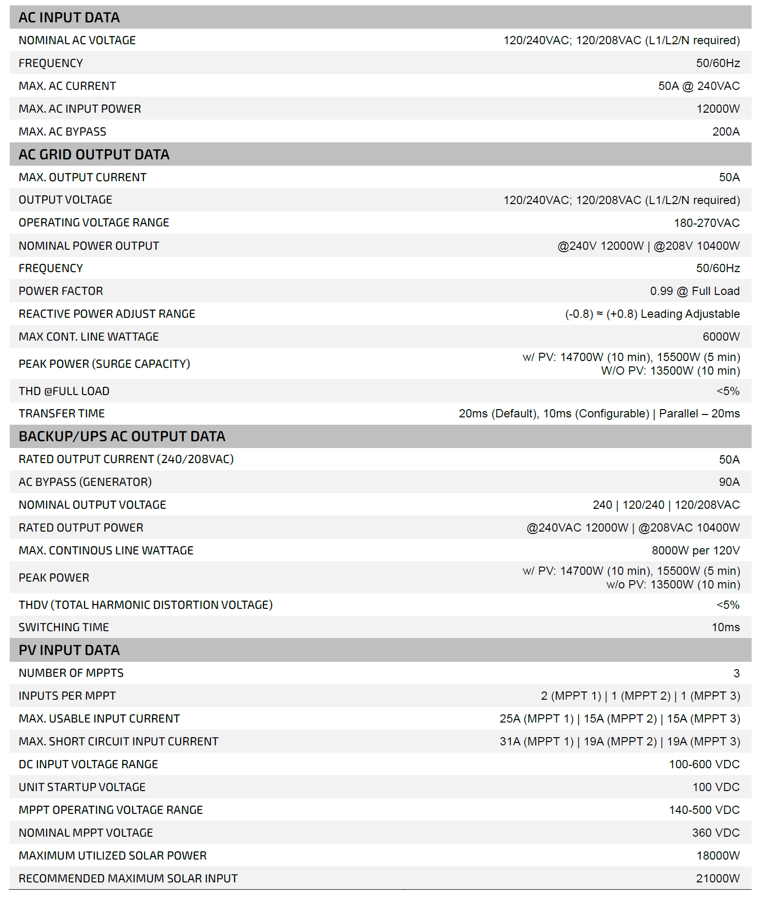 EG4, 18KPV-12LV Hybrid Inverter, 18kW PV Input, 12kW Output, 12,000-watt 120/240-120/208Vac, 60Hz, 48VDC, Transformerless Sinewave, Grid Tie/Off-Grid, AC or DC Coupled, 3 MPPT PV inputs, 600Vdc Max, with AFCI/GFDI, SunSpec RSD Transmitter, 2 CT’s, Rule-21, NEMA 4X/IP65, EG4INV18KPV00V2 The EG4 18kPV is a 48V split-phase, hybrid inverter/charger capable of utilizing 18kW of PV and efficiently outputting 12kW of power while charging the battery bank. Parallel up to 10 units for 120kWs of AC power. Control multiple stations and units using the new EG4 monitoring software. This cutting-edge 12K (18kPV) Hybrid Inverter from EG4 is a versatile, all-in-one inverter and charger, capable of supporting even the most robust home power systems with a rated power of 12000W and the ability to handle PV arrays of up to 18000W. This high-tech inverter guarantees a simple, plug-and-play installation, and comes equipped with an in-depth LCD touch screen interface and remote monitoring capabilities for enhanced visibility and a smoother user experience during operation, as well as 3 MPPT inputs, built-in circuit breakers, and an integrated UPS module for seamless input switching in only 15 – 30ms. Plus, by leaving behind outdated transformer-based designs, this 12K inverter is able to remain lightweight and energy-efficient, consuming minimal power during idling periods, without having to compromise on surge capacity or line imbalance capabilities. This cutting-edge inverter supports a variety of working modes and system configurations, so whether you’re looking to enhance your home’s solar system, or upgrade your homestead’s off-grid ESS setup, this inverter can handle a wide range of home power applications. Plus, through its smart load control, AC coupling abilities, and peak shaving function, you can meet your power needs and protect your home against unstable grids and rolling blackouts, while seeing huge savings each month on your electric bill. Order today to optimize your home’s power with the state-of-the-art 12K (18kPV) All-in-One Inverter & Charger from EG4. |
