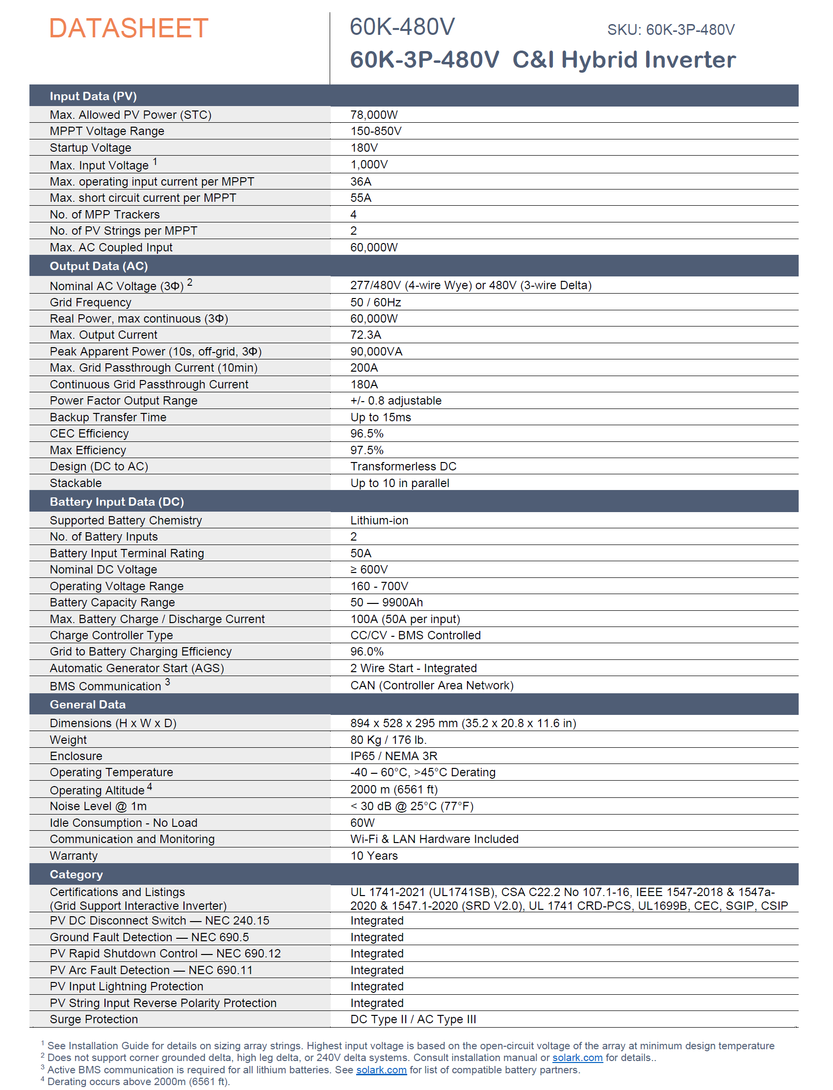 Loading... Please wait...| Sol-Ark 60K-3P-480V 60K 3-Phase Output 480/277 Vac Hybrid Inverter. High Voltage Battery (160-800V). Nema 3-R. 10 Year Standard Warranty - 60K-3P-480V |