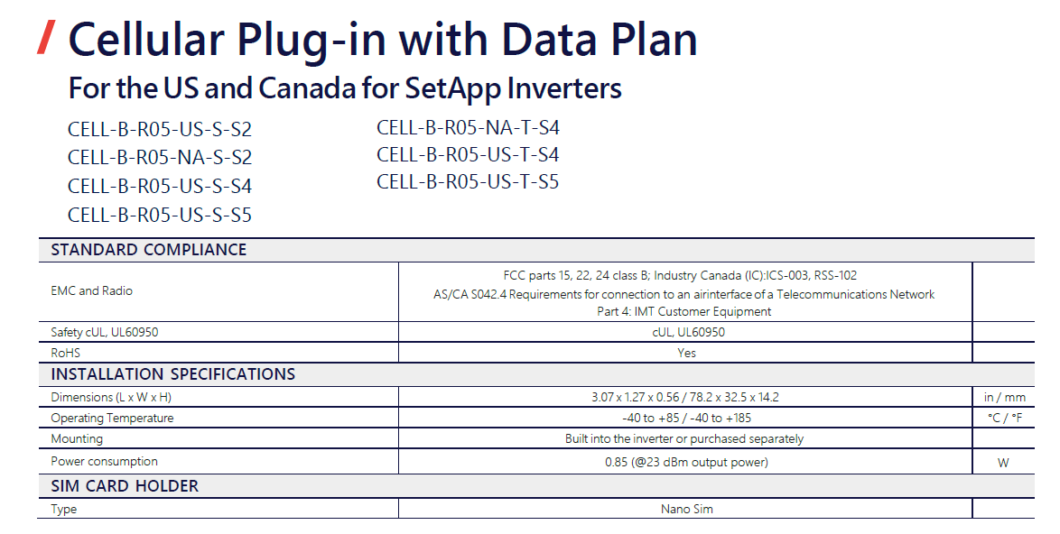 Cellular Plug-in w/plan, AC²1000kW, 5 year plan, Commercial SetApp Inverter Sale of Cellular Modem and 5-year Plan shall be subject to the "SE-Communication-plan-terms and conditions".SolarEdge is a global leader in smart energy technology. By leveraging world-class engineering capabilities and with a relentless focus on innovation, SolarEdge creates smart energy solutions that power our lives and drive future progress. Continuing to advance smart energy, SolarEdge addresses a broad range of energy market segments through its PV, storage, EV charging, UPS, and grid services solutions. Features