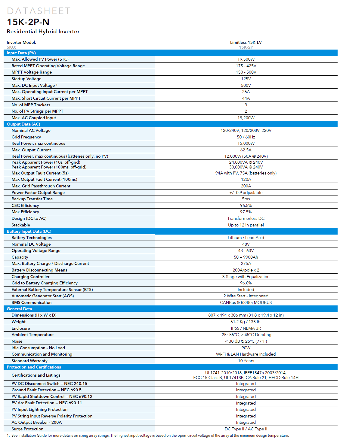 MUST be ordered in multiples of full box qty: 1 This product has transitioned from the SKU: OLD SA-15K-2P Sol-Ark Limitless 15K-LV Hybrid Inverter - 220V | 120/240V | 120/208V - 200A passthrough, integrated ATS breaker, 3 MPPT, 2 of 3 legs 3p. Can be used with 48V batteries. 10-Year Standard Warranty. Features