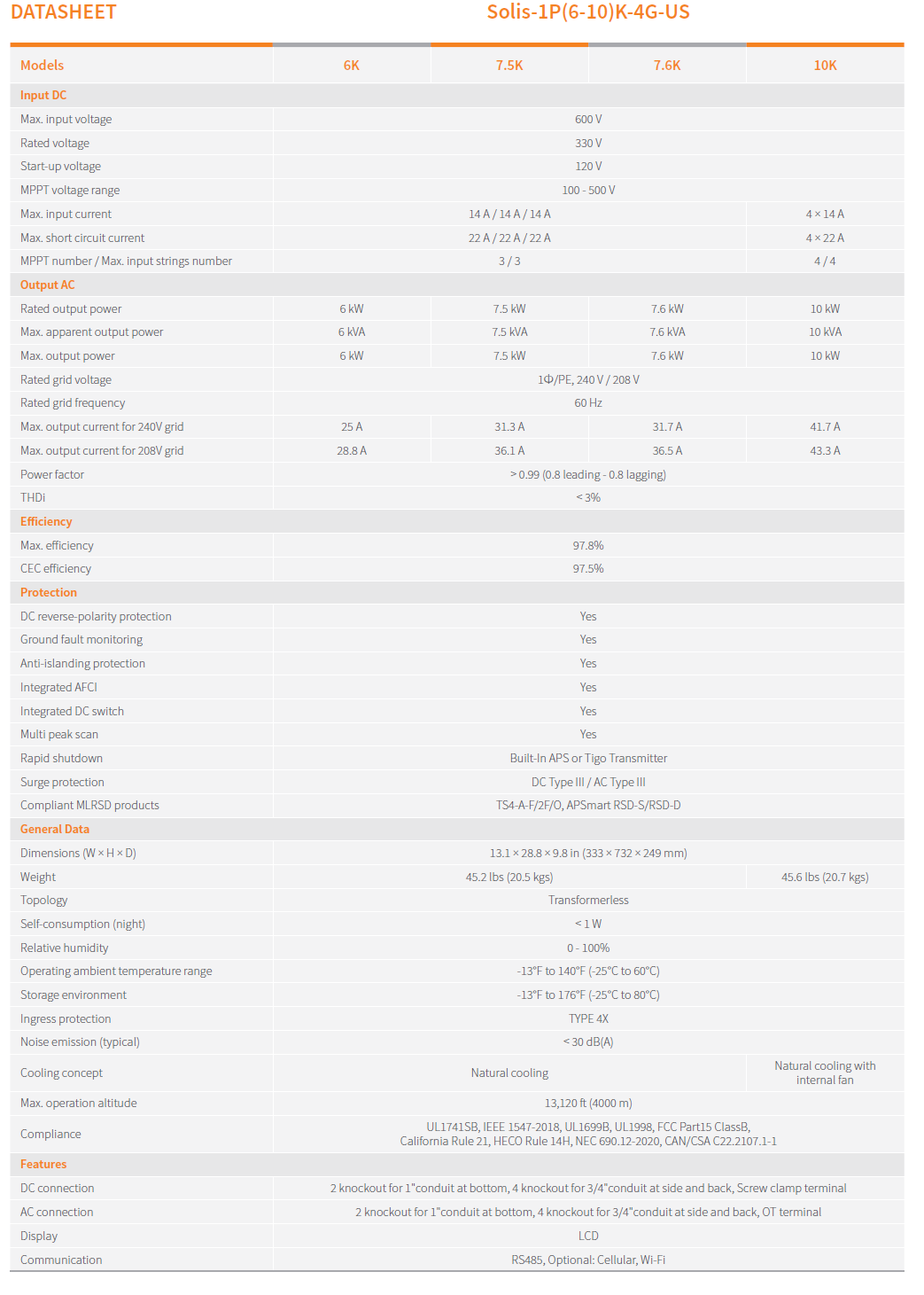 Solis Solar Inverter 7.6kw 4G Single phase Three MPPT. US Version. with APS transmitter. with RGM. with 10 years warranty. Solis Single Phase Grid-Tied Inverters Features