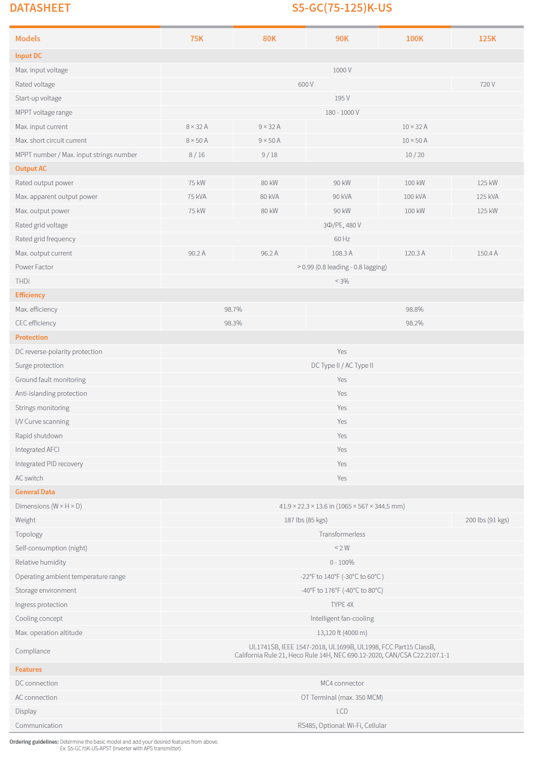 Solis SLS-S5-GC-125K-US-APST 125kW Three Phase Inverter 480Vac Ten MPPT with APS Transmitter - SLS-S5-GC-125K-US-APST |