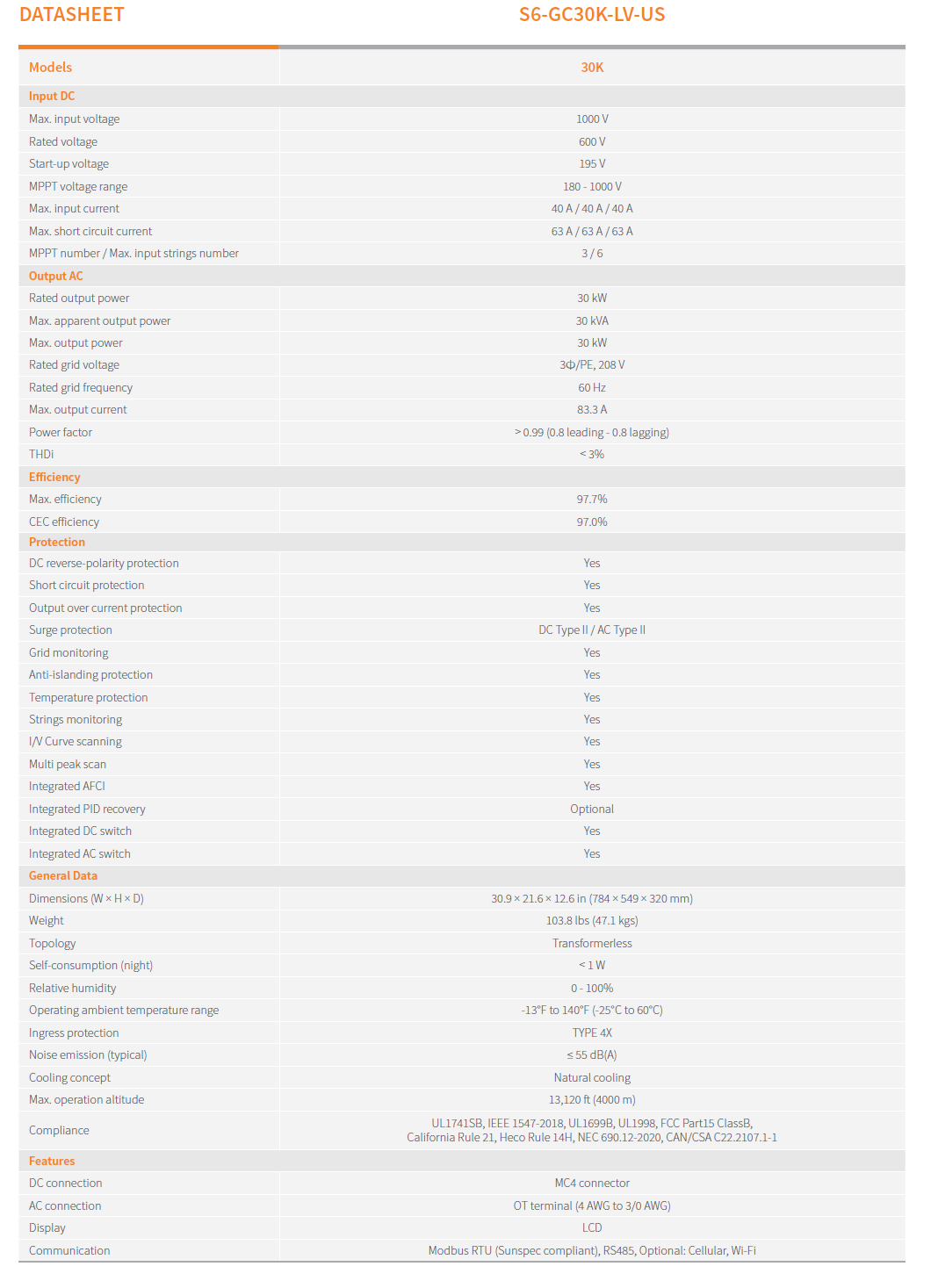 Solis SLS-S6-GC30k-LV-US-APST 30kW Three Phase Inverter 208Vac Three MPPT w/ AFCI w/APS TX
