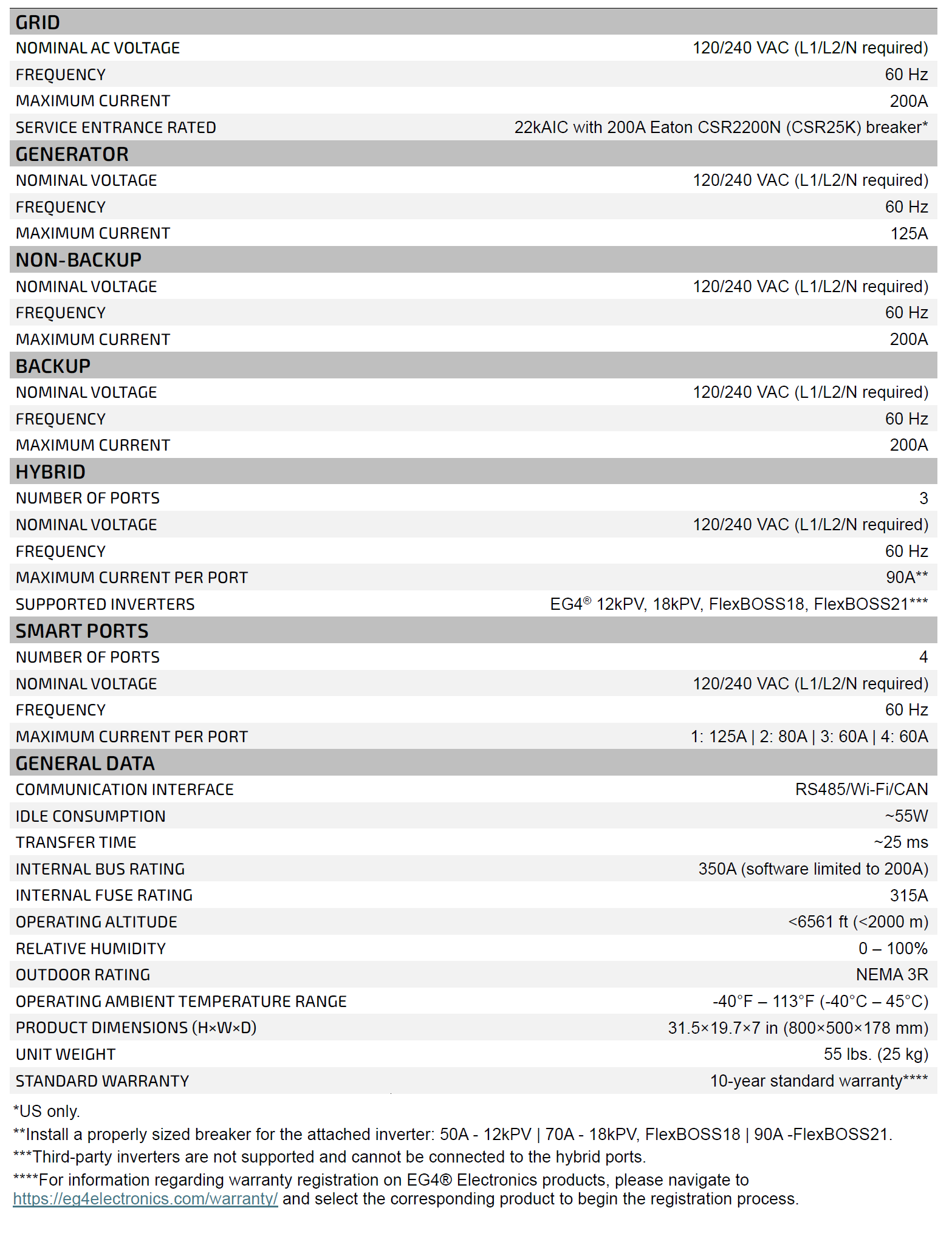 EG4, GridBOSS Microgrid Interconnect Device (MID), Split Phase, 200A Max, 60Hz, NEMA 3R, Excluding Breakers EG4MID2P200AV3.1 The EG4 GridBOSS Micro-Grid Interconnection Device (MID) simplifies Energy Storage Systems (ESS) by consolidating multiple components into a single, innovative unit. It replaces traditional elements such as the point of common connection, back-fed breakers, feeder taps, tap breakers, supply-side taps, transfer switches, and dedicated combiner panels for grid-in, grid-out, and generator input. As a versatile solution, the GridBOSS serves as the service entrance equipment* when paired with the utility meter, providing a single point of connection for utilities, hybrid inverters, generators, smart loads, and AC-coupled inverters. |