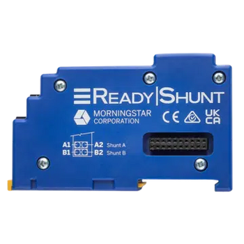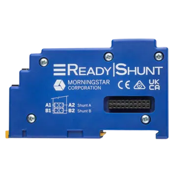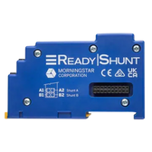 ReadyShunt is a battery meter and DC current sensor that provides visibility to critical battery information including SOC (state-of-charge) and other key metrics essential to battery and off-grid system health. It supports lead acid, lithium, and other battery chemistries. ReadyShunt easily snaps into a ReadyRail-equipped Morningstar product. After following operating manual instructions to connect your battery, the ReadyShunt is recognized and activated. Part of the ReadyBlock suite of add-on– yet built-in– functionality available in Morningstar “host” components featuring the ReadyRail expansion system.