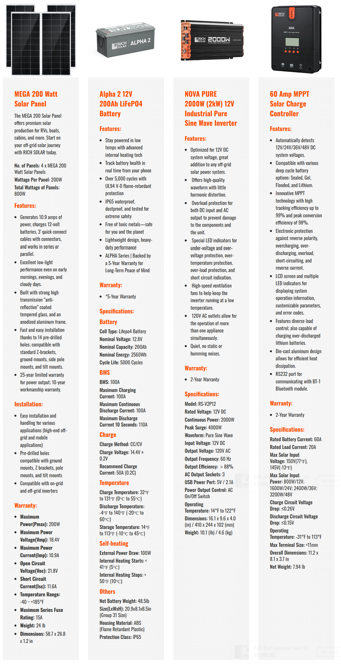 Our 800W 12V Complete Solar Kit provides everything you need to start capturing, storing, and utilizing solar energy. The kit includes four high-efficiency 200W Monocrystalline panels, a 60A MPPT controller, a 2000W 12V inverter, and an Alpha 2 Lithium battery. Ideal for installation on your RV or tiny home, this kit equips you with a seamless solar adventure. Build your energy independence today! Features Kit Includes: