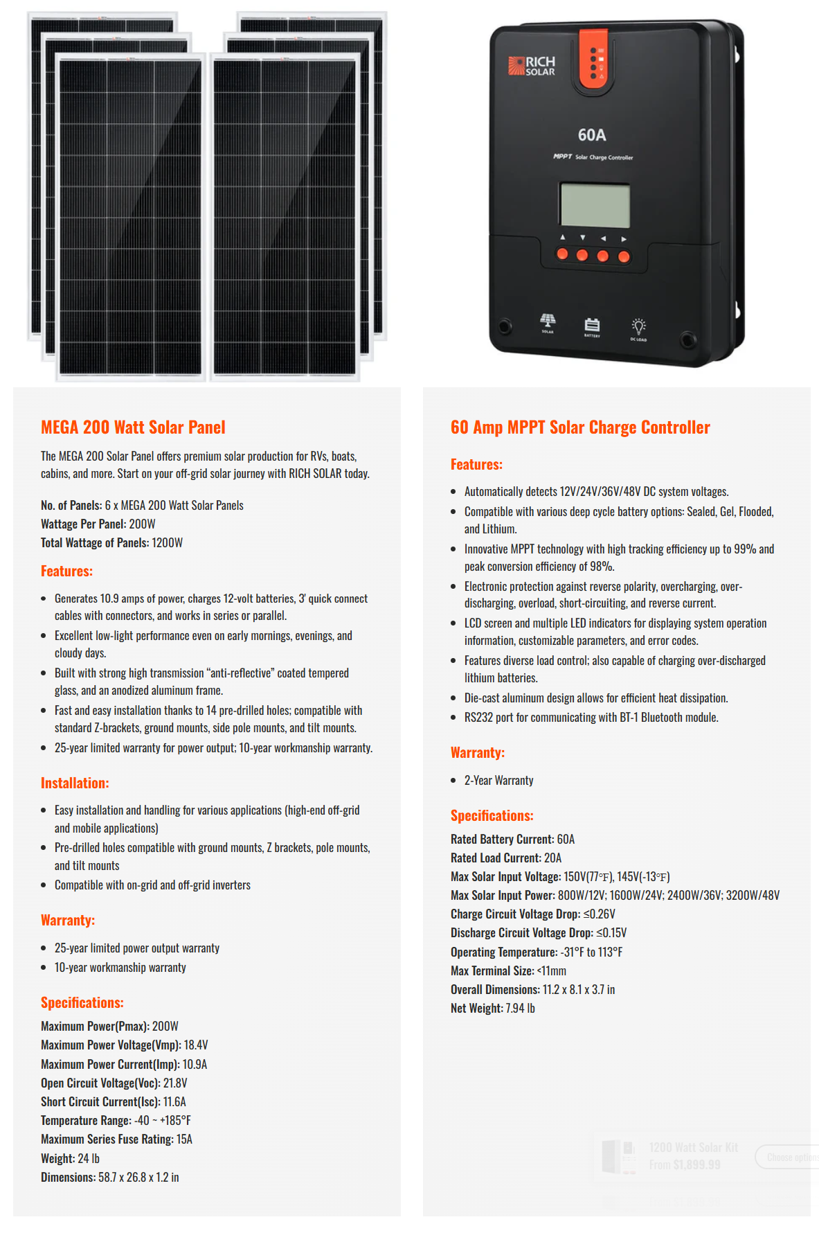 This 24V 1200W kit contains 6 high-efficiency 200W Monocrystalline panels with 18 busbars and our 60A MPPT controller. For a quieter, more peaceful outdoor experience, go solar now and start powering your RV, boat, or trailer! Features Kit Includes: