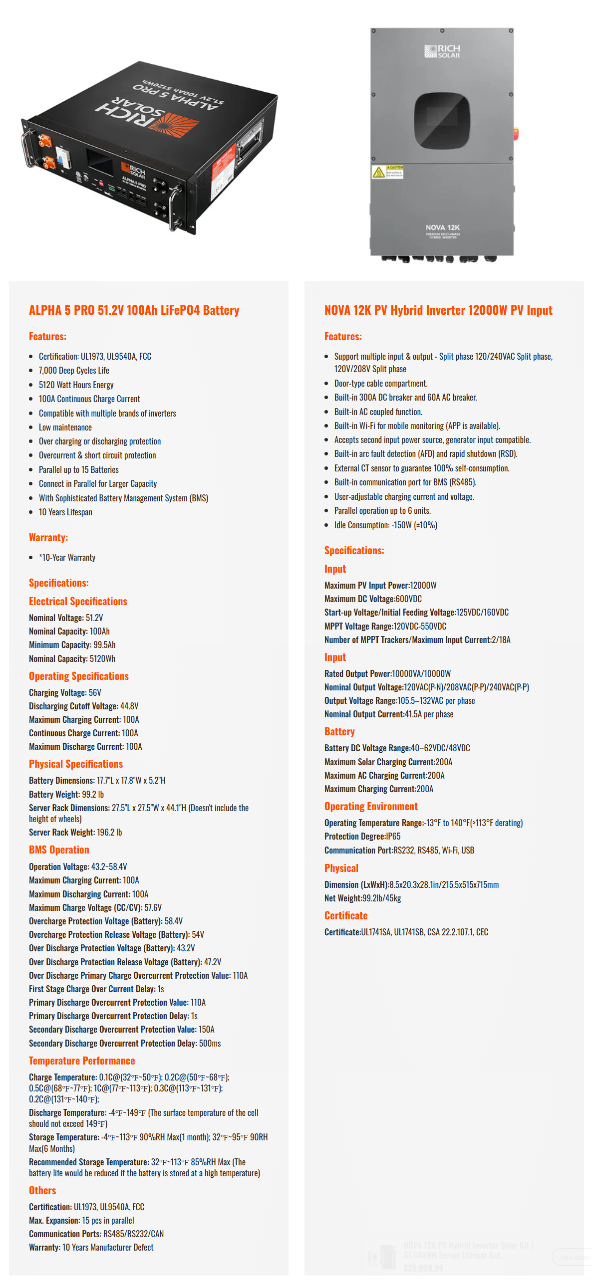 Loading... Please wait...| Rich Solar SRx12-H12Kx1-NO NOVA 12K PV Hybrid Inverter Solar Kit | 61.44kWH Server Lithium Battery [KIT-SR0002] - SRx12-H12Kx1-NO |