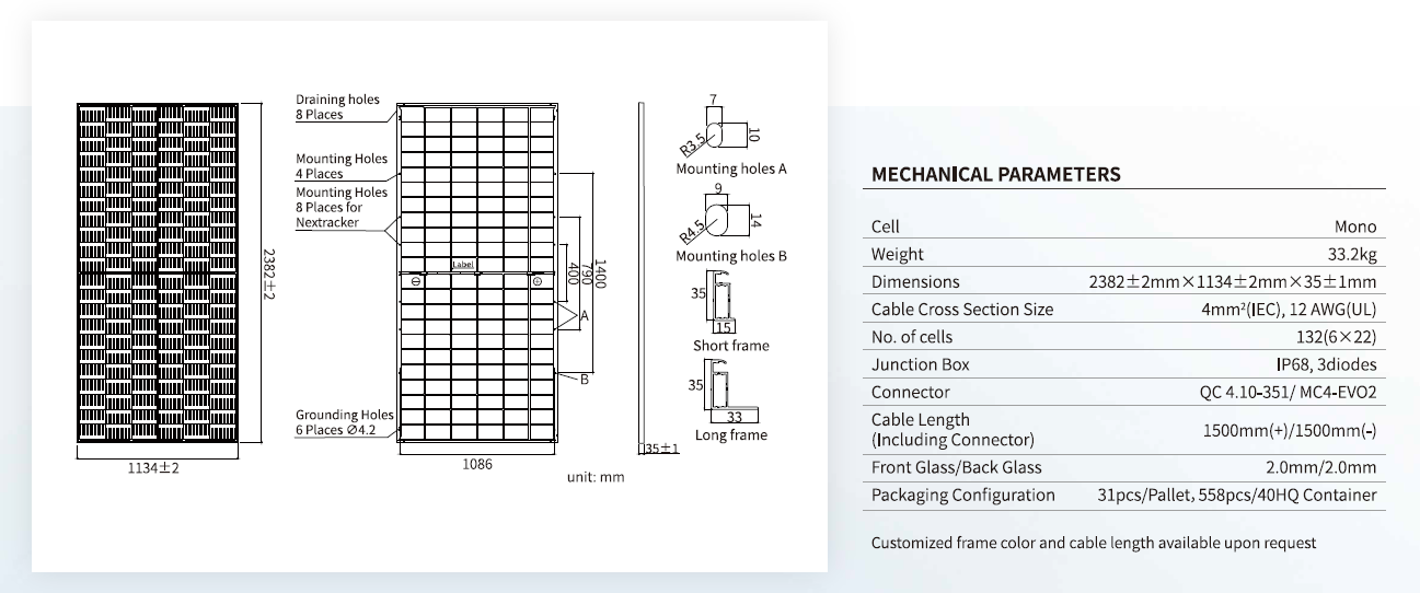 JA 620w D45 Series Bifacial, 132 half cell module: silver frame, Glass Backsheet, QC 4.10-351 / MC4 Connectors This product is supplied with MC4 connectors Features