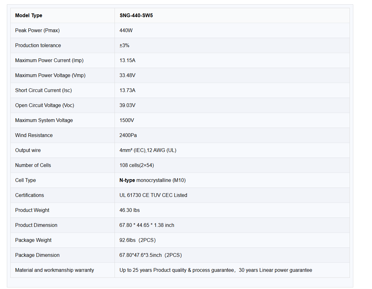 Loading... Please wait...| SunGoldPower SNG-440-SW5 440W Mono Black N-Type Solar Panel Full Pallet (31 Panels) UL61730 CEC Listed - SNG-440-SW5-Pallet |