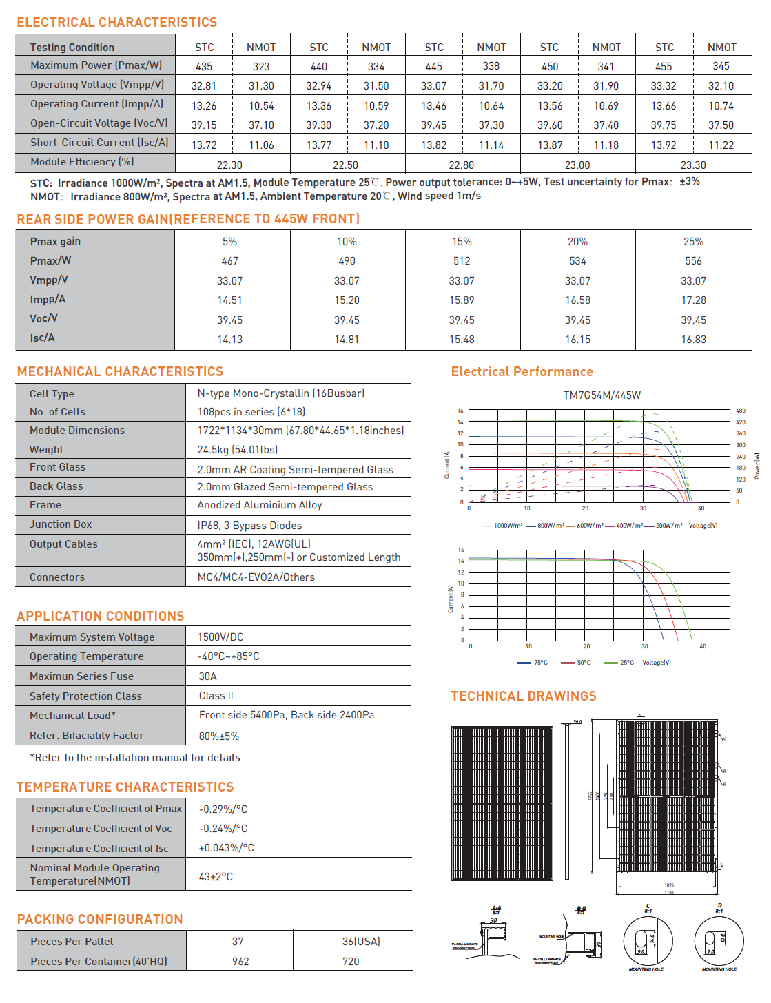 Talesun TM7G54M-450 W All-Black N-Type TOPCon Bifacial Dual-Glass Solar Module – ~23% Efficiency, 15-Yr Product / 30-Yr Performance Warranty - TM7G54M-450M |