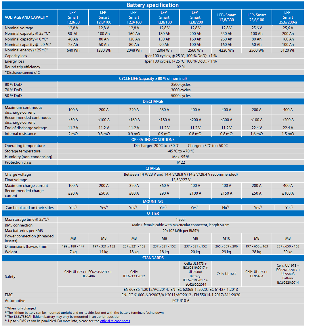 Victron Energy Lithium Battery Smart batteries are Lithium Iron Phosphate (LiFePO4) batteries and are available in 12.8 V or 25.6 V in various capacities. They can be connected in series, parallel and series/parallel so that a battery bank can be built for system voltages of 12 V, 24 V or 48 V. The maximum number of batteries in one system is 20, which results in a maximum energy storage of 84 kWh in a 12 V system and up to 102 kWh in a 24 V1) and 48 V1) system. Features