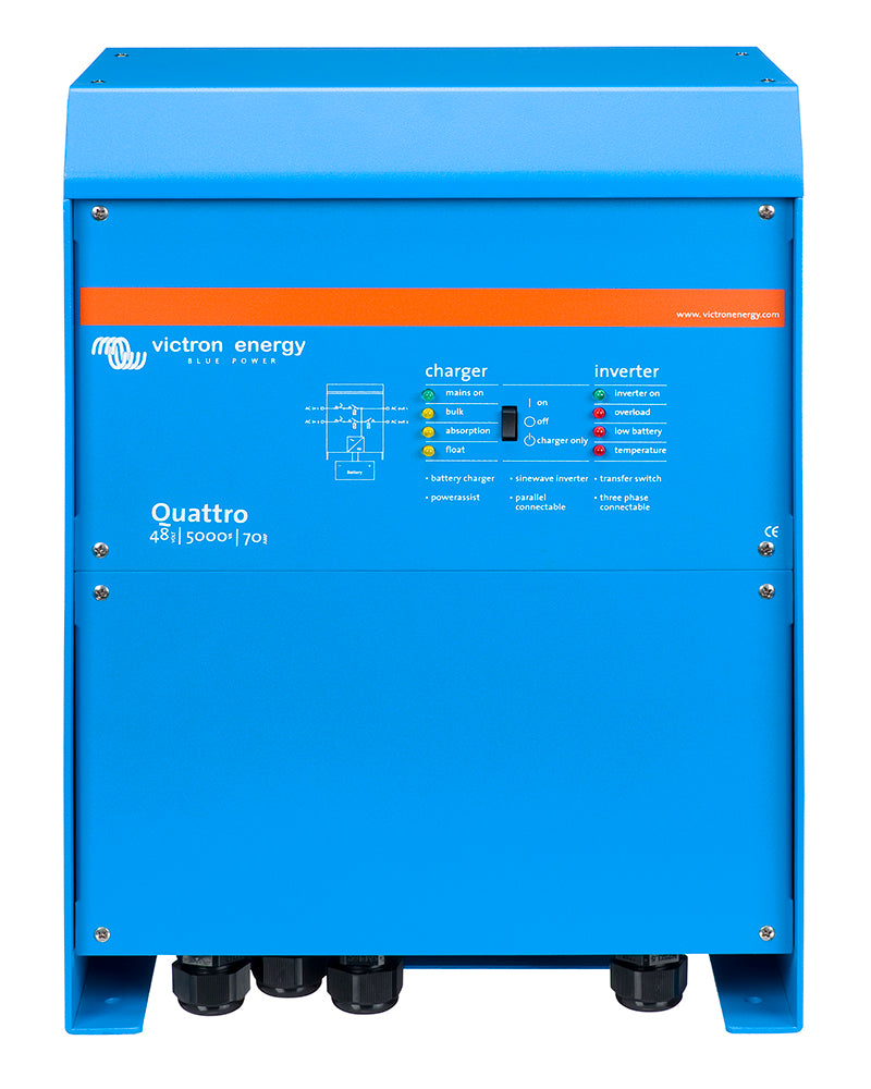 Similar to the MultiPlus, the Quattro is also a combined inverter and charger. Additionally it can accept two AC inputs and automatically connect to the active source. Its many features include a true sine wave inverter, adaptive charging, hybrid PowerAssist technology plus multiple system integration features such as three or split phase operation and parallel operation.